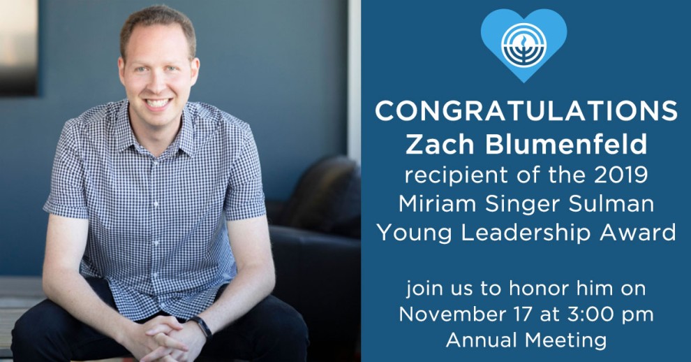Zach Blumenfeld’s motto, speaks volumes about how he leads his life. His commitment to working to improve the lives of others are qualities we hold dear at the Jewish Federation of Madison, and we’re so glad he shares some of that dedication with us and our community. The Jewish Federation of Madison has a long tradition of recognizing future leadership potential. We’re proud to announce that Zach Blumenfeld will receive the Miriam Singer Sulman Young Leadership Award this year at the Annual Meeting of the Jewish Federation of Madison on Sunday, November 17, 2019, at 3:00 pm at the Irwin A. and Robert D. Goodman Jewish Community Campus in Verona. Named in 1975 in memory of Miriam Singer Sulman, a much admired and dynamic young Jewish Federation of Madison leader, this award enables the recipient to attend the Jewish Federations of North America General Assembly.